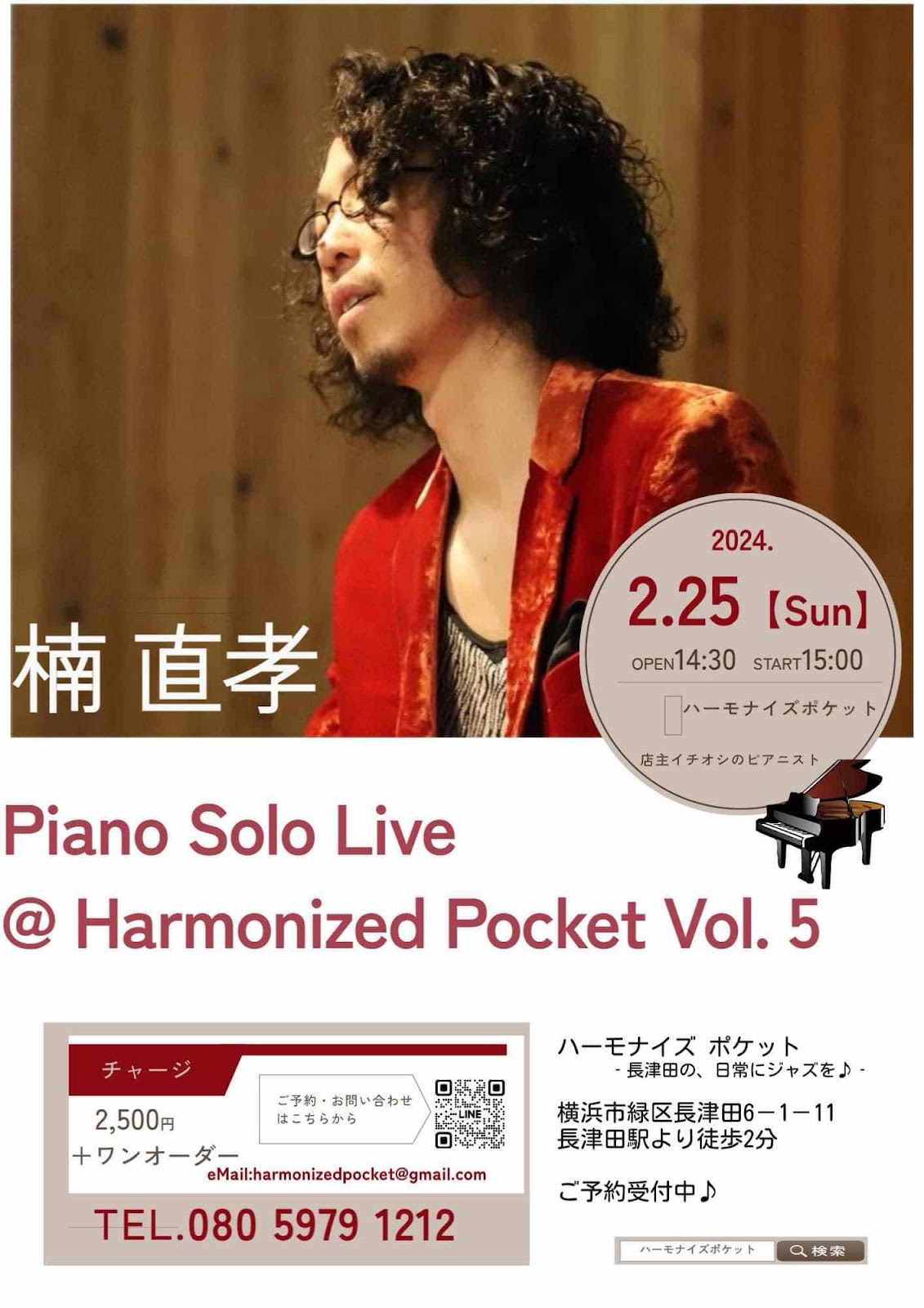 2月25日の日曜日は15:00から長津田ハーモナイズポケットにてピアノソロ!