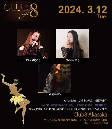 3月12日の火曜日は赤坂クラブエイトにて、KANANさん、Chihiroさんと共演です!