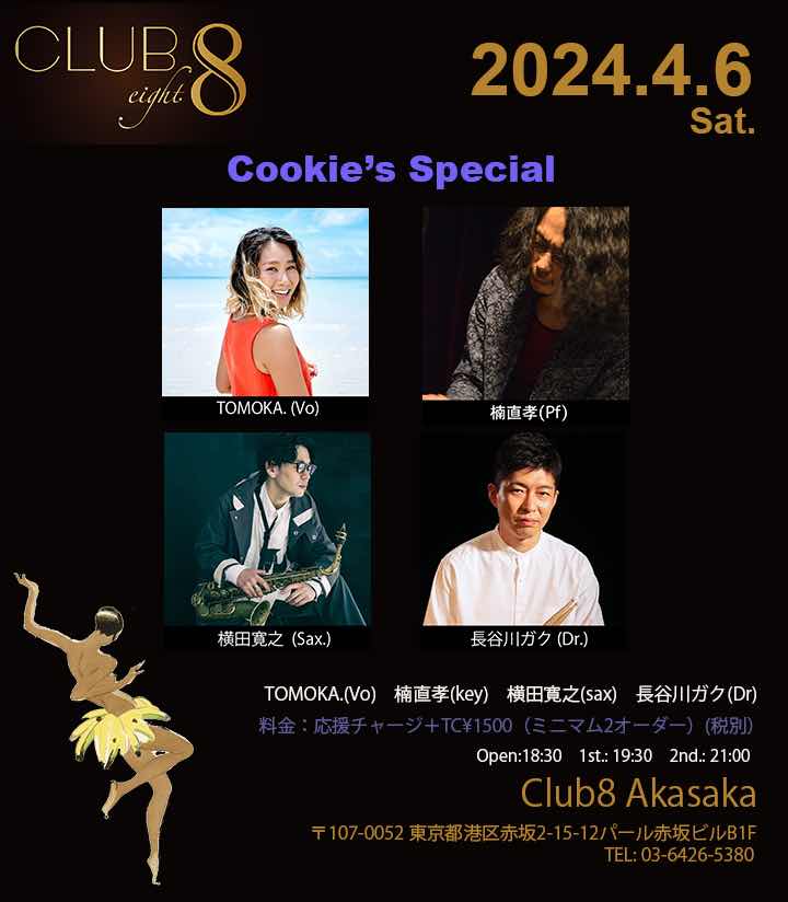 4月6日の土曜日は19:30から、赤坂クラブエイトにて楠直孝オルガントリオ+TOMOKA.!