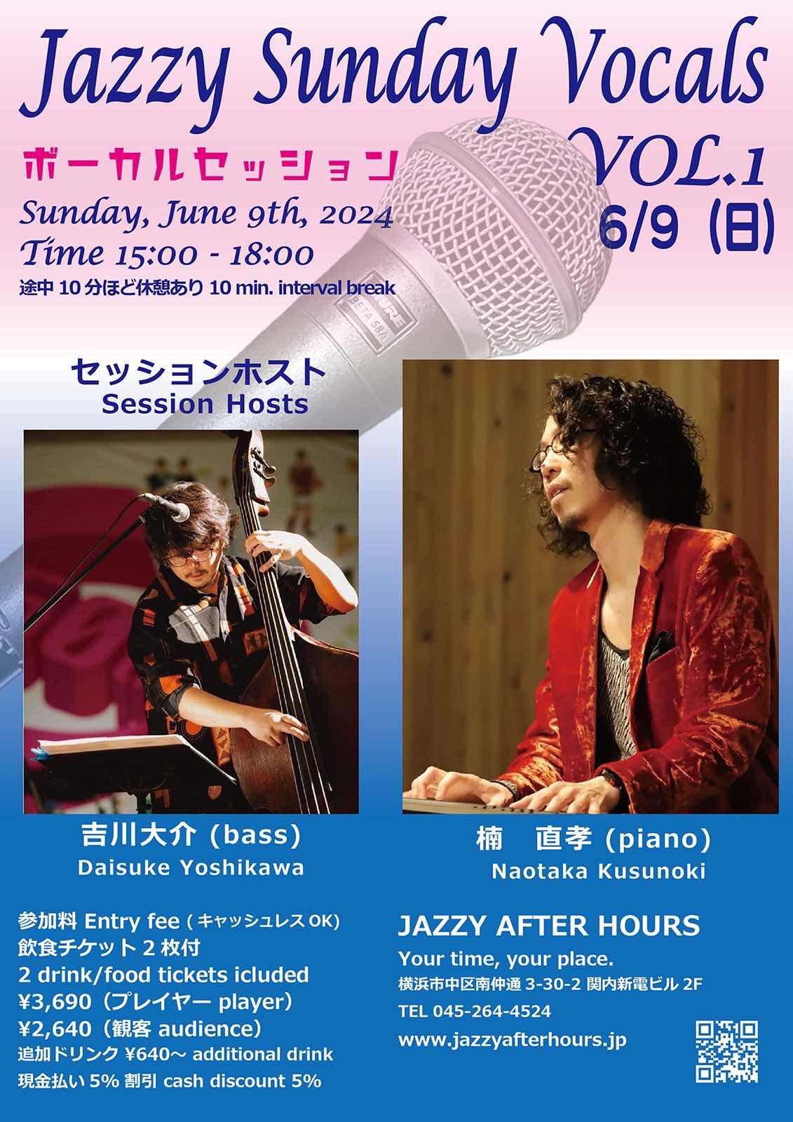 6月9日の日曜日は15時から関内ジャジーアフターアワーズにてボーカルセッションです!